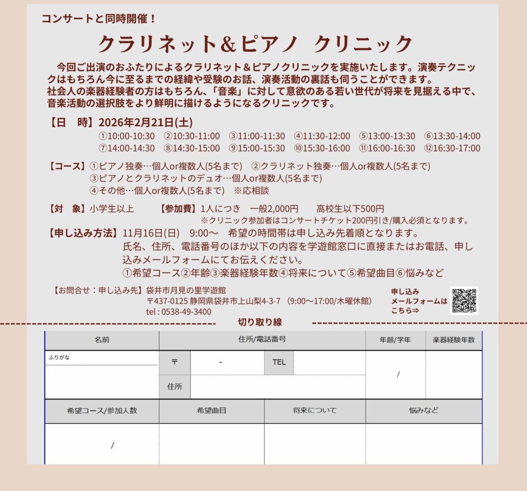 2月22日(日)『クラリネット&ピアノ デュオコンサート』の出演者によるクラリネットとピアノのクリニックを2月21日(土)に開催します。