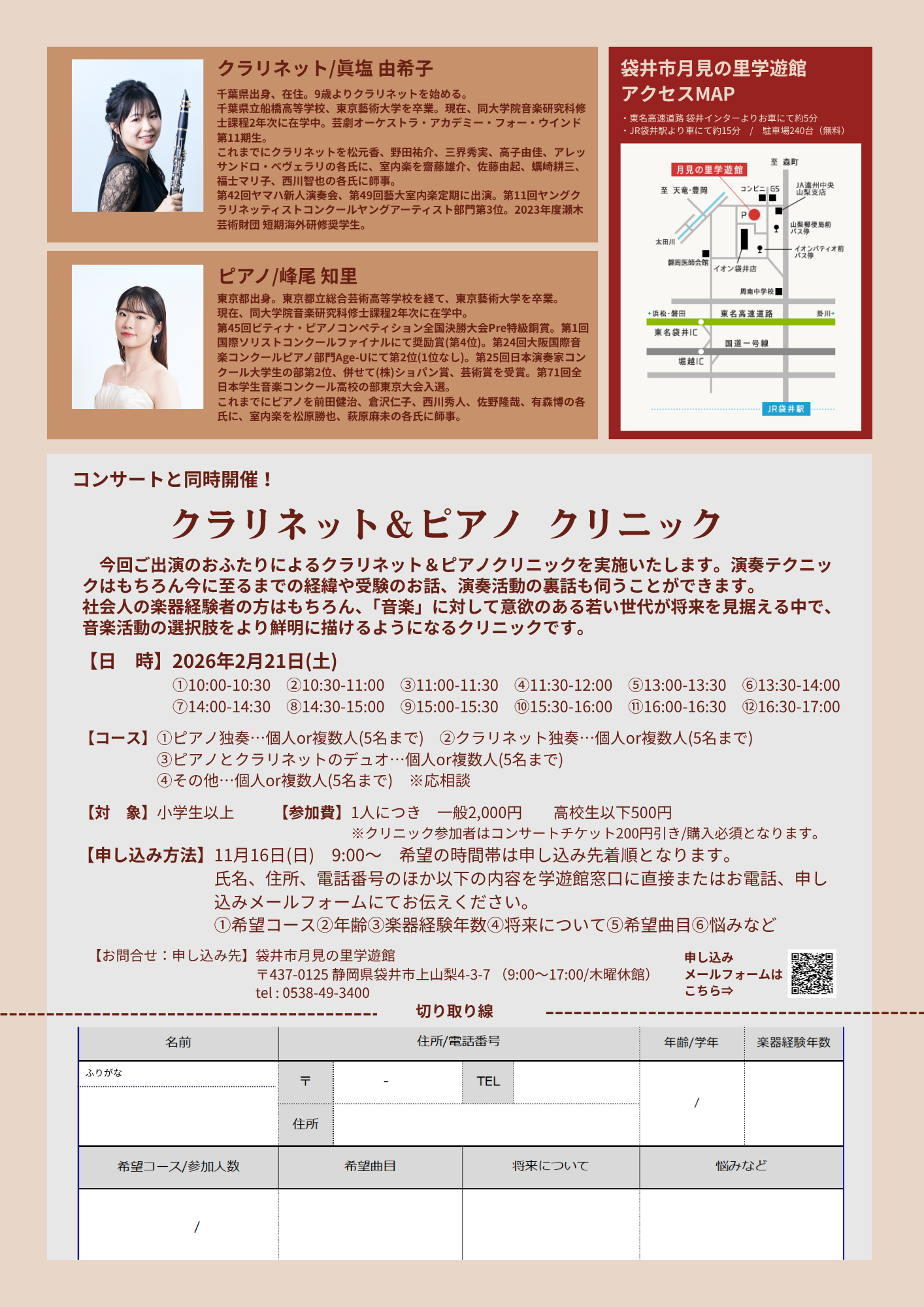 出演者によるクラリネットとピアノのクリニックも同時開催いたします。